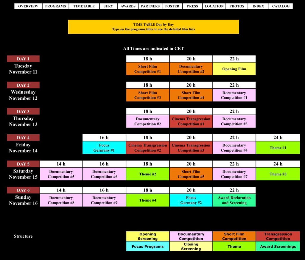 Es ist kein „Fühl-Dich-wohl- und-vergiss-Deine-Probleme“ Festival, sondern im Gegenteil ein Festival, das dem Zuschauer Einblicke in Situationen, Räume und Kulturen verschafft, die ihm sonst nie zugänglich wären. Gleichzeitig ein Festival, das erlaubt, andere Filmsprachen zu entdecken, provokant, verstörend, faszinierend, ein Gegengewicht zur massenmedialen Manipulation.