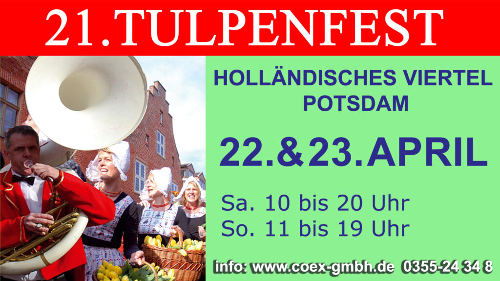 Das erstmals von der Cottbuser Agentur COEX in Kooperation mit dem Förderverein zur Pflege niederländischer Kultur in Potsdam e. V. veranstaltete Tulpenfest ist am Samstag von 10 bis 20 Uhr und am Sonntag von 11 bis 19 Uhr geöffnet (Erwachsene zahlen 6 Euro, Kinder bis 14 Jahre sind frei).