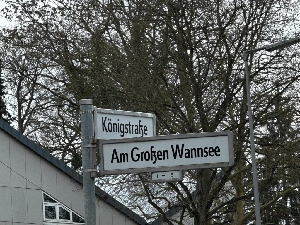 Unser Weg führt uns in die Straße „Am Großen Wannsee“. Der Straßenname klingt nicht nur nach Wasser. „Am Großen Wannsee“ ist eine rund zwei Kilometer lange Uferstraße im Berliner Südwesten. Sie startet an der Königstraße, einem Abschnitt der Bundesstraße 1. Von dort folgt sie – fast wie mit dem Lineal am Ufer entlang – der Uferlinie des Großen Wannsees, ohne über weite Strecken einen direkten Seezugang zu bieten.