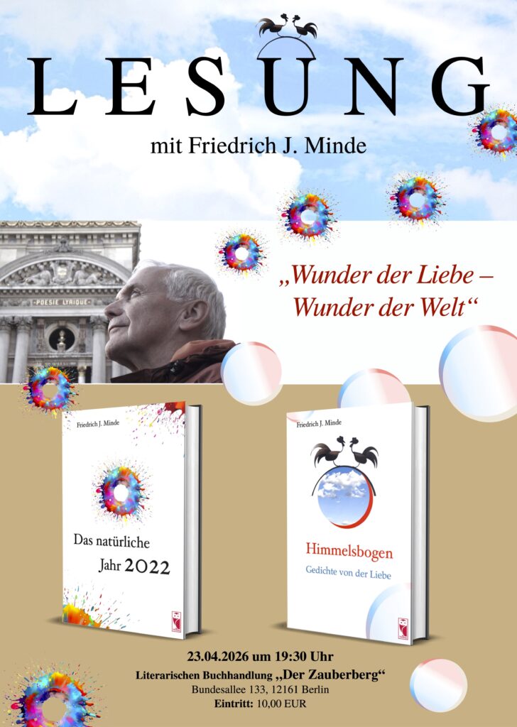 Am 23. April 2026 liest der Autor Friedrich J. Minde aus seinem Buch „Das natürliche Jahr 2022“ in der Buchhandlung „Der Zauberberg“ (Bundesallee 133, 12161 Berlin). Die Veranstaltung beginnt um 19:30 Uhr, der Eintritt beträgt 10 €. Eine Anmeldung ist erforderlich und kann telefonisch unter 030-56 73 90 91 oder per E-Mail an info@der-zauberberg.eu erfolgen.