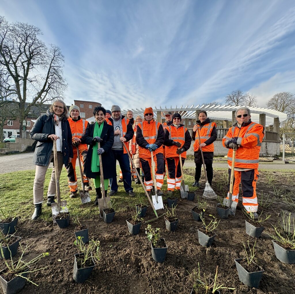 Aufwändige Neubepflanzung am Zeltinger Platz, die Bürgermeisterin packt mit an. (Foto: BA Reinickendorf)