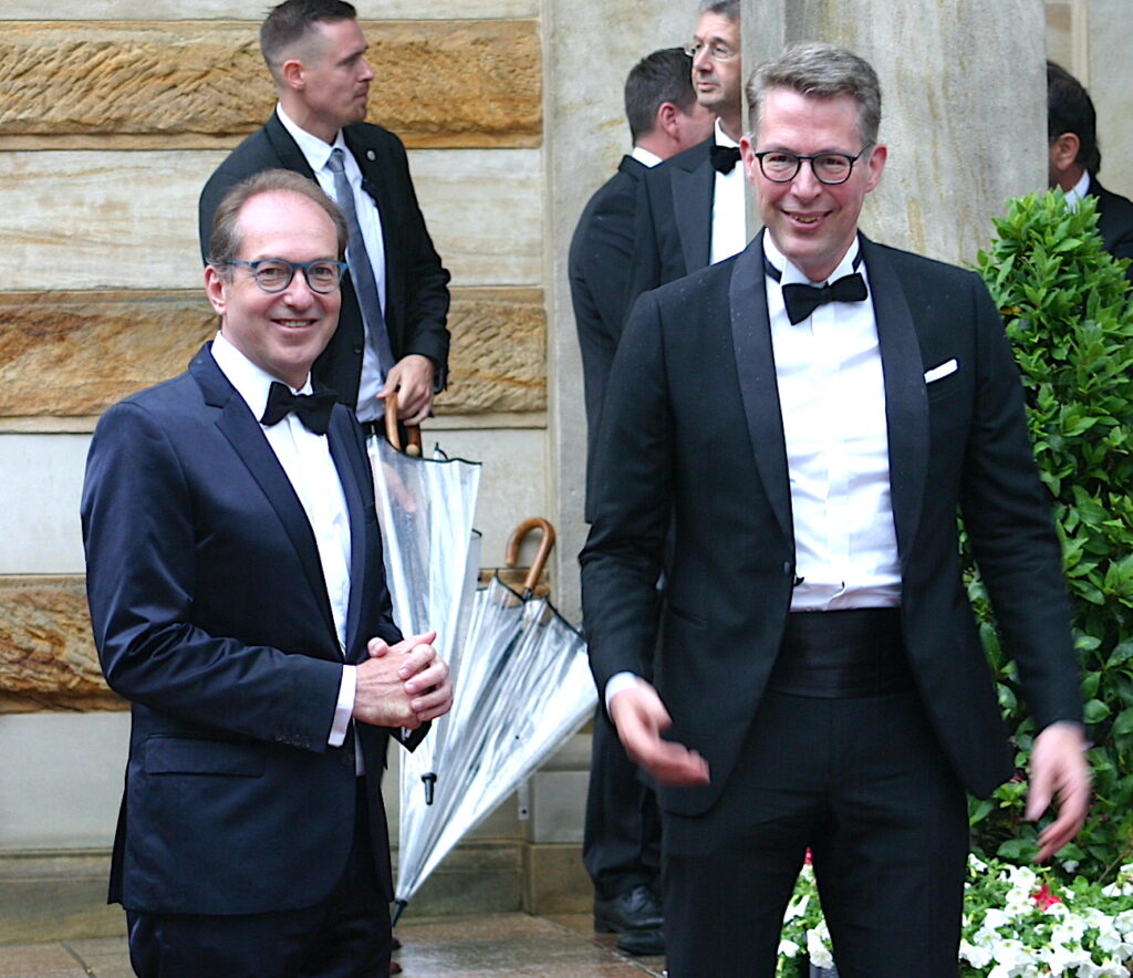 Er begann elegant und galant, als die geladenen Gäste die heiligen Hallen betraten. Wir trafen auf dem Roten Teppich: Präsidentin der Europäischen Kommission Ursula von der Leyen (CDU) und Tatort-Kommissarin Maria Furtwängler, Oberbürgermeister Thomas Ebersberger (CSU) mit Ehefrau Stefanie Hellbach und die ehemalige Parlamentarische Staatssektärin Dagmar Wöhrl (CSU), Kabarettist „Dreggsagg“ Michl Müller. Ministerpräsident Markus Söder (CSU) sah man unter den geladenen Gästen ebenso wie Angela Merkel (CDU); Alexander Dobrint, Chef der CSU-Landesgruppe im Bundestag und Bayerns Kulturminister Markus Blume(CSU).Ebenso sah man die stv. Fraktionsvorsitzende der CDU/CSU-Bundestagsfraktion Dorothee Beer mit Ehemann und die Beauftragte der Bundesregierung für Kultur und Medien, Staatsministerin Claudia Roth (Bündnis 90/Die Grünen). Die Regensburger Fürstin Gloria von Thurn und Taxis; Ricarda Lang, Co -Vorsitzende von Bündnis 90/Die Grünen und Katharina Schulze, Fraktionsvorsitzende der Grünen im Bayerischen Landtag, waren auch anwesend.
