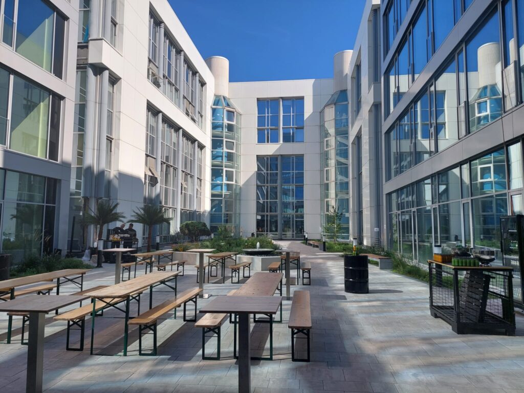 Der Campus hält für die Mieter viele Extras bereit: Campus-WLAN, Fahrradstellplätze, eine Tiefgarage mit E-Ladepunkten, Duschen und Umkleideräume und eine Paketstation sind vorhanden. Über die Mieter-App lassen sich Konferenzräume und Mietwagen buchen oder Speisen bestellen. Aufwendig gestaltete Grünflächen bieten Platz zur Erholung oder für lockere Meetings. Zukünftig bringt eine rund 600 m2 große Gastro-Area das großstädtische Food-Angebot Berlins nach Schönefeld und im Co-Working-Bereich können Mieter und externe Nutzer kurzfristig Arbeitsplätze oder Konferenzräume buchen.