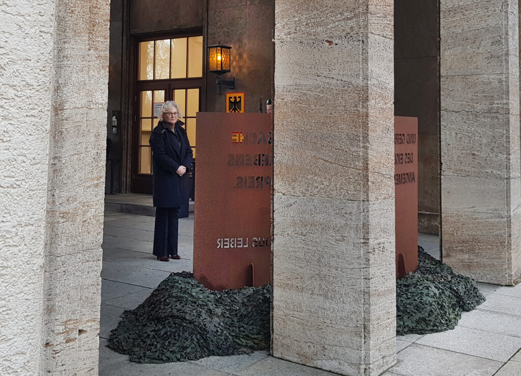 Brigadegeneral Andreas Henne, der Stellvertretende Kommandeur, begrüßte die Bundesverteidigungsministerin. Zuerst gedachte man des Namensgebers der Kaserne. Der 1891 geborene Reichstagsabgeordnete Julius Leber (SPD) war ein Widerstandskämpfer gegen das menschenverachtende NS-Regime und wurde am 5. Januar 1945 in der Haftanstalt Plötzensee hingerichtet. Christine Lambrecht würdigte den heldenhaften Einsatz des Widerstandskämpfers und legte unter militärischen Ehren einen Kranz an der Gedenkstehle von Julius Leber nieder.