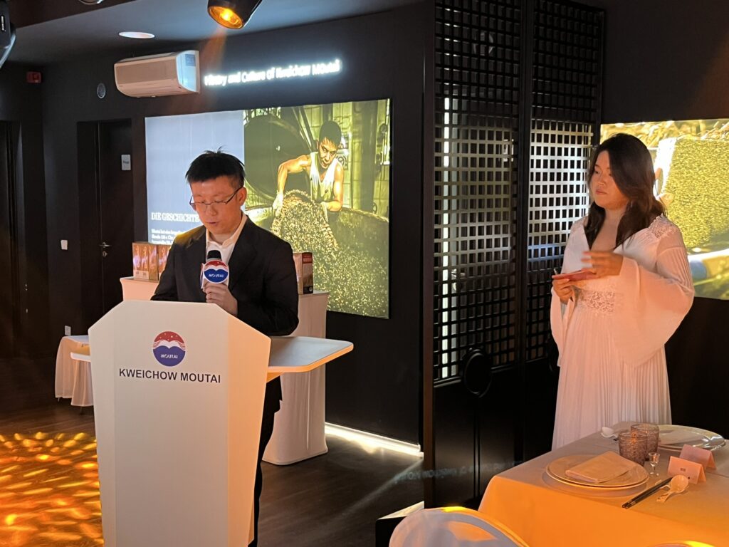 Es folgten traditionelle Tanzdarbietungen aus Guizhou durch junge, zugleich traditionelle Guizhou-Gewänder tragende Damen, bevor für die Veranstalterin Herr Ye Zhaowei das Wort ergriff. Er erläuterte i die Philosophie der Moutai (Maotai) Herstellung als Ausdruck von Geduld, Präzision und Respekt gegenüber der Natur. Es sei ein Teil bedeutender chinesischer Kultur, die man gerne mit Deutschland teile. Er forderte die Gäste dazu auf, den Moutai „mit allen Sinnen zu genießen“.