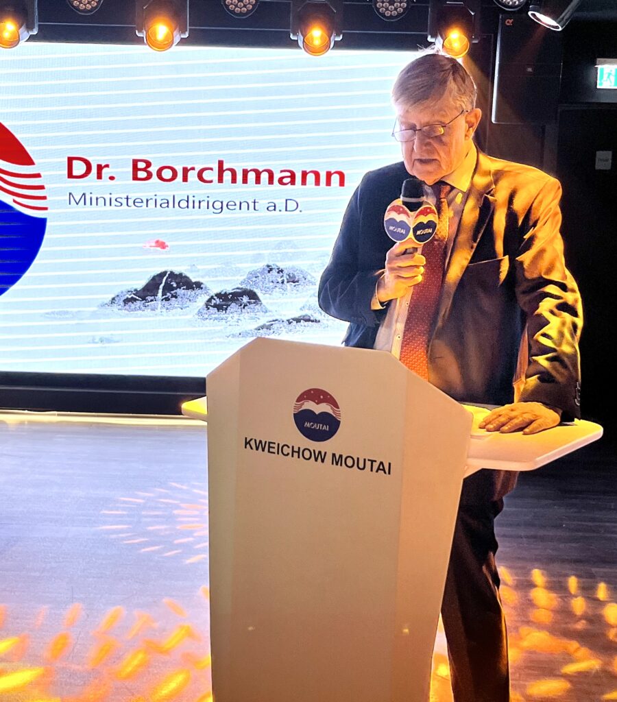 Als Gastredner begrüßte MDgt. a.D. Dr. Michael Borchmann diese Initiative. Moutai gehöre gemeinsam mit französischem Cognac und schottischem Whisky zu den hochwertigsten Getränken der Welt. Gleichwohl sei seine Bekanntheit in Deutschland noch beschränkt. So werde er selbst von Gastronomie-Kennern immer wieder gefragt, ob Moutai ein „Reisschnaps“ sei.