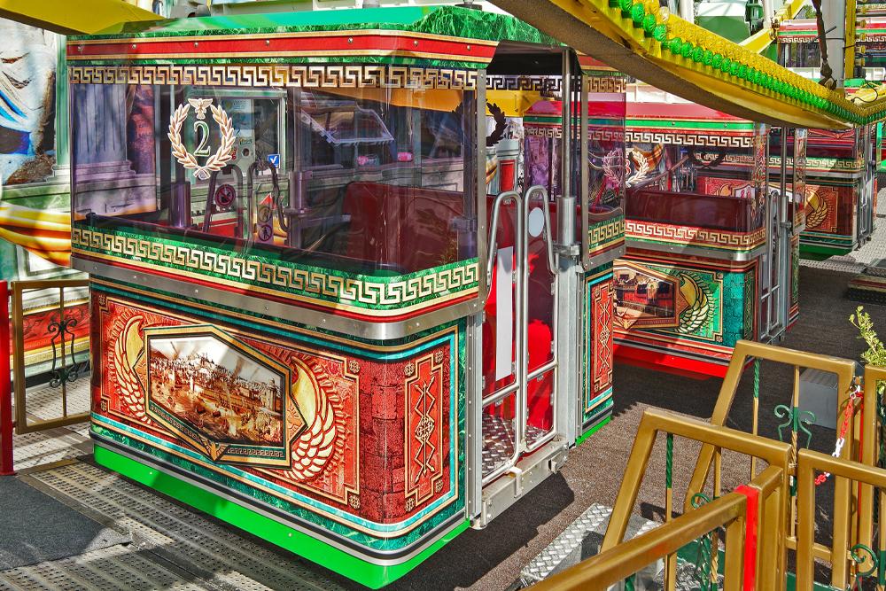 Zum „Jupiter“ gehört nach Angaben des Besitzers Rudolf Barth auch eine rollstuhlgerechte Gondel. Die schmuckvollen Verzierungen des römischen Themas und die Beleuchtung machen das „Jupiter Riesenrad“ zu einem schon von Weitem sichtbaren Blickfang auf dem Cranger Kirmesplatz.