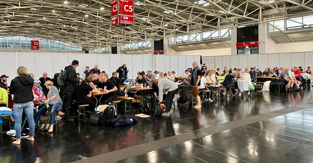 Es regnet so stark, dass sich viele Fans durch Absperrungen hindurch Zugang zu den Messehallen verschaffen. Das Management bleibt gelassen, zumal die sicheren Messehallen zum Sicherheitskonzept gehören.