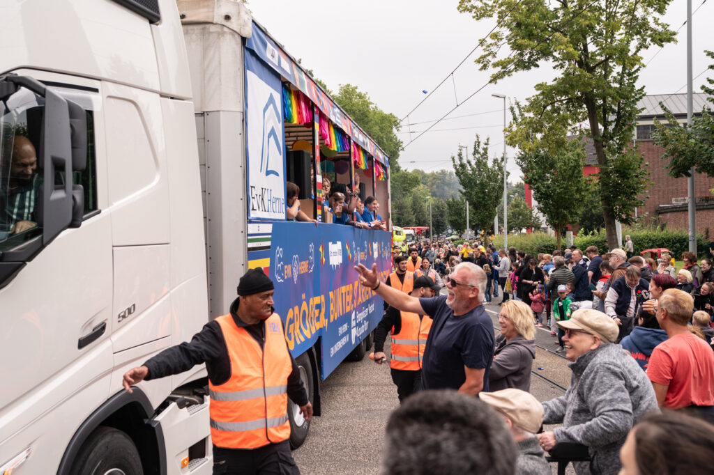 Beim Schaulaufen vor der Tribüne am Buschmannshof stellte Hans Peter Karpinski, Vorsitzender des Herner Stadtsportbundes, nach der Reihe „seine Sportler“ vor – die Zugdauer betrug etwa 100 Minuten. Bei Einfallsreichtum, Kreativität und Herzblutfaktor zeigten sich die Vereine und Organisationen bunt und vielfältig. Die dreiköpfige Jury mit Marvin Boettcher (Geschäftsführender Gesellschafter: Mondpalast von Wanne-Eickel), Dr. Dirk Drenk (Geschäftsführung: Wirtschaftsförderungsgesellschaft Herne mbH) und Jochen Schübel (Pressebüro Cranger Kirmes) nahm alle genau unter die Lupe wählte die attraktivsten und originellsten Festwagen und Fußgruppen aus. „Einfach gute Stimmung zu haben, die sich auf die Jury überträgt“, war in den Augen von Marvin Boettcher eine gute Voraussetzung.