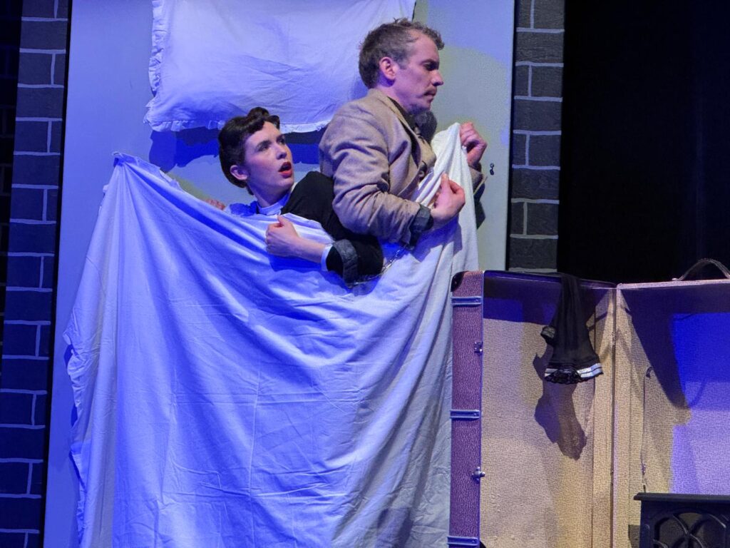Richard Hannay gespielt von Johannes Kalle Schäfer und Mascha Stummer in verschiedenen Frauenrollen (Foto: BiWe)