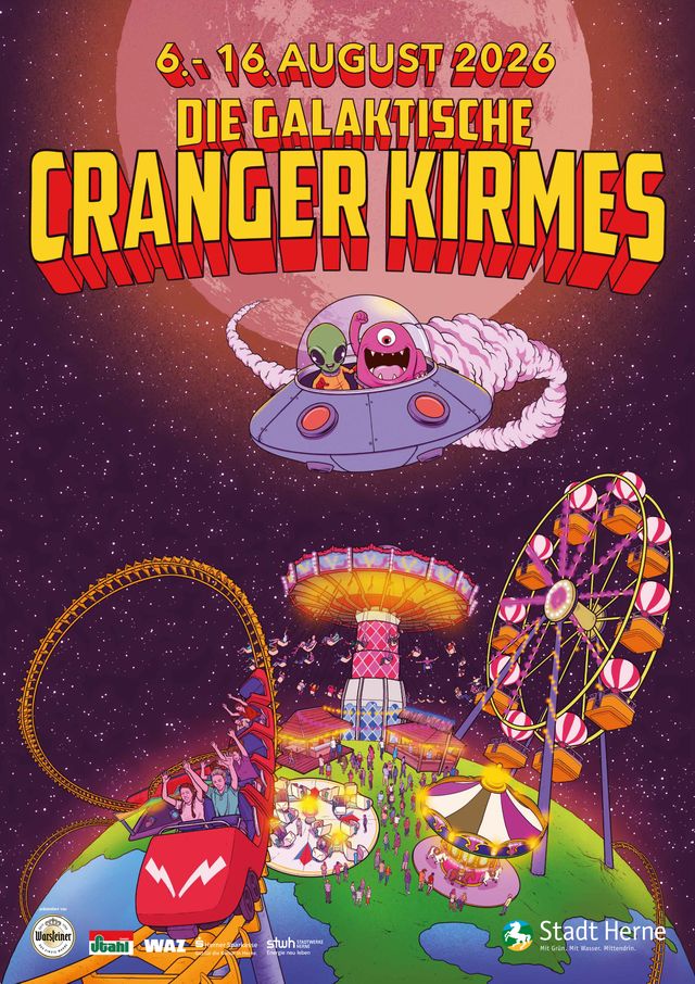 Das neue Kirmesplakat erzählt die Geschichte zweier Außerirdischer, die in einer fliegenden Untertasse zur Cranger Kirmes reisen. Rund 230 Tage bevor sich die Karussells offiziell wieder drehen, hat Hernes Oberbürgermeister Dr. Frank Dudda am 17.12. zusammen mit Vertretern des Fachbereichs Öffentliche Ordnung, des Stadtmarketings und der Astronomischen Arbeitsgemeinschaft Wanne-Eickel/Herne e. V. in der Herner Sternwarte das neue Kirmesplakat vorgestellt.