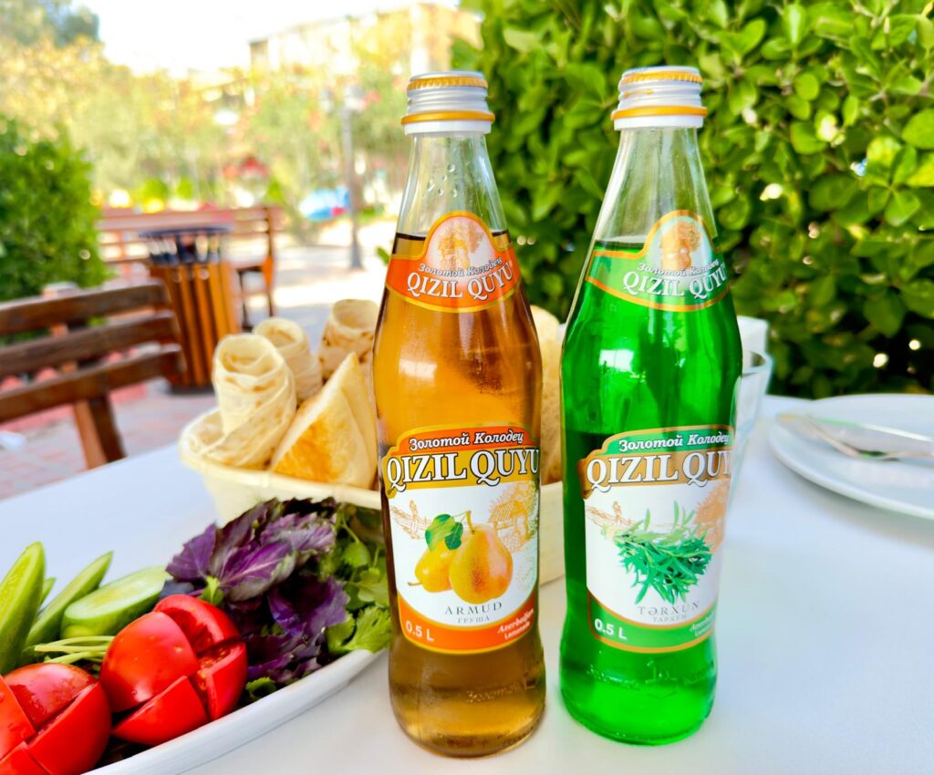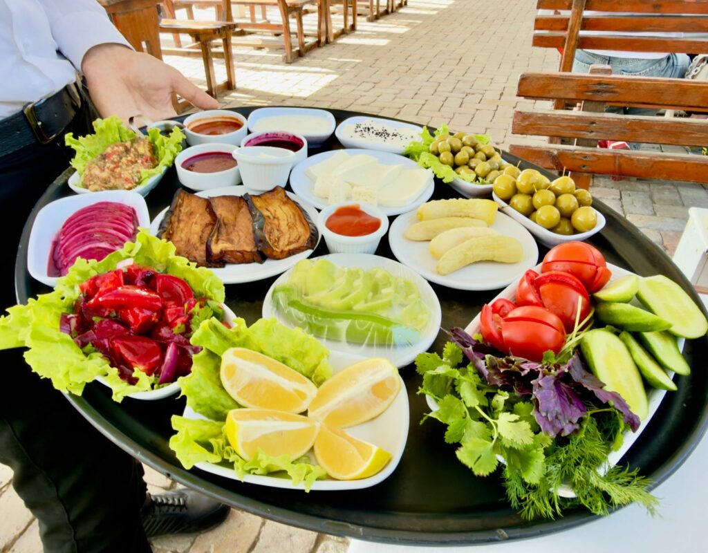 Der Kellner, besser die Kellner, tragen Fischplatten auf. Der Gast zeigt auf den bzw. die Fische, die er verzehren möchte. Ebenso bringt der Kellner auf einem großen Tablett oder via eines Teewagens Salate und Gemüse am Tisch des Gastes vorbei. Auch hier wählt der Gast wiederum aus, was er an Salaten und Gemüsen auf seinem Teller vorfinden möchte. Dazu kann man Reis, Kartoffeln in jeder Form, also Salzkartoffeln, Pommes Frites, Püree und Brot bestellen. Dazu sollte man Säfte aus Aserbaidschan trinken.