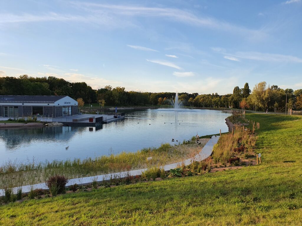 Erfurt entwickelte im Zusammenhang mit der diesjährigen BUGA, der Bundesgartenschau, einen zusammenhängenden Grünzug entlang des westlichen Flusslaufes der Gera. Damit wurden und werden im Norden der Landeshauptstadt bereits bestehende Grünanlagen erweitert, aufgewertet und durch neu gewonnene Parkanlagen zur Geraaue gestaltet, als Publikumsmagnet entwickelte sich der 10.000 Quadratmeter große Auenteich mit dem Café am See. Eine große Holzterrasse lädt dazu ein, Kaffee und Kuchen direkt am Wasser zu genießen.