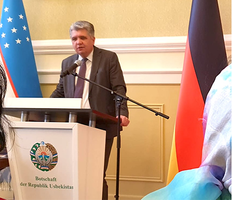 S. E. Herr Botschafter Dilshod Akhatov: „Wie es allgemein bekannt ist, war das Territorium des heutigen Usbekistans eine der alten Wiegen der menschlichen Zivilisation. Schon in der vorislamischen Zeit war diese Region ein Zentrum hochentwickelter Kulturen und Staatlichkeiten, wovon heute noch jahrtausendalte materielle und immaterielle Befunde, zeugen.