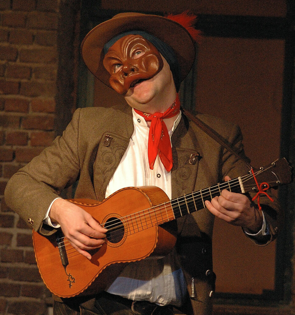 Beim Schreiben einiger Zeilen, die nicht so recht gelingen wollen, entsteht in ihm eine Figur: Der Taugenichts. „Geh los“ ist der Aufruf seiner inneren Stimme. Der Dichter lässt sich darauf ein und es beginnt eine poetische Reise. Jürgen Skambraks, der das Stück geschrieben und inszeniert hat und selber spielt, gelingt der Rollenwechsel schnell durch Kopftuch, Hut und einer Arlecchino-Maske (gestaltet von Silvia Chávez). Mit dieser kunstvollen Maske gleichzeitig Präsenz zu schaffen, Gitarre zu spielen, zu singen und komplexe rhythmische Bewegungen zu meistern sind eine ordentliche Herausforderung. Jürgen Skambraks meistert sie mit seiner großen