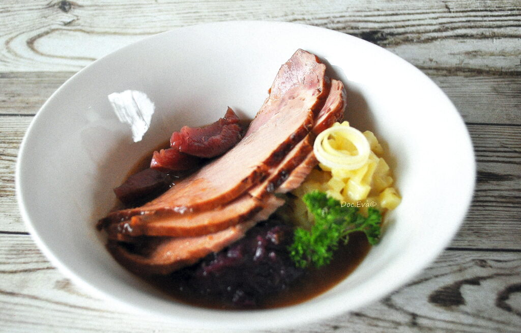 Kassler mit Rotkohl und Bechamelkartoffeln Foto: Dr. E. Schaefers