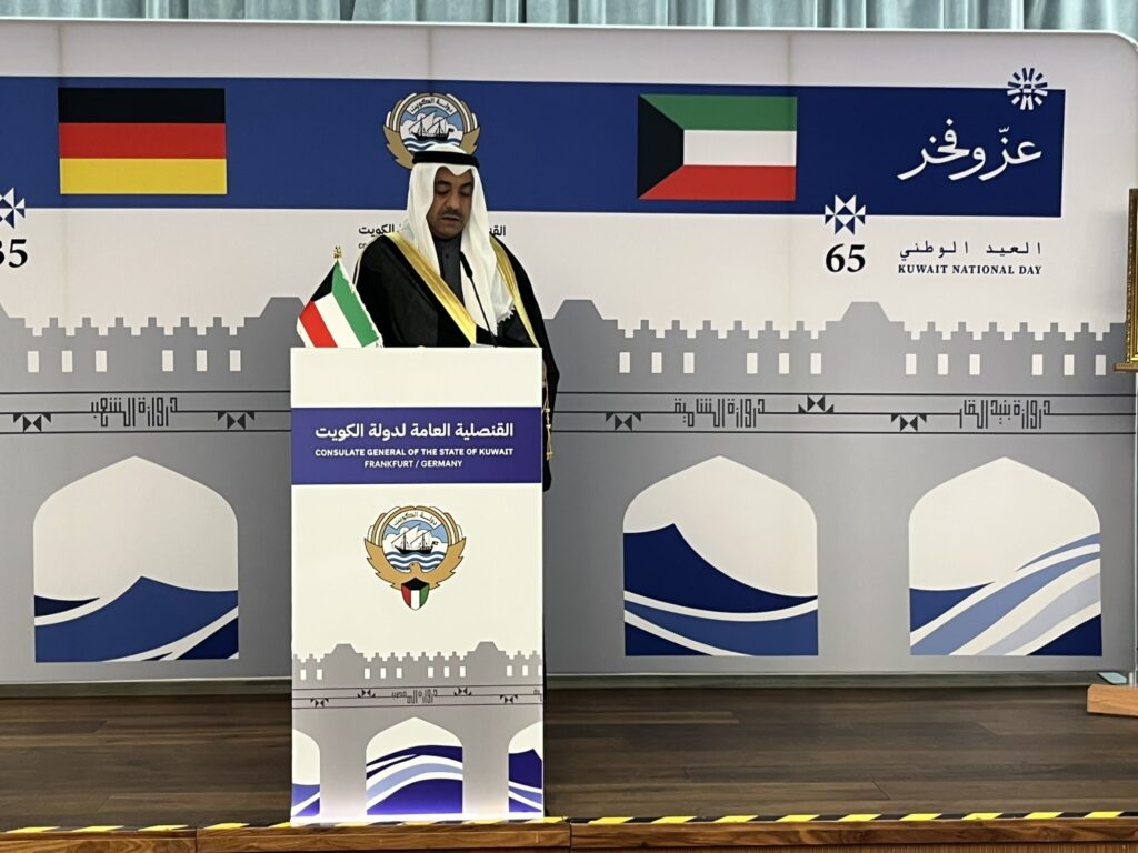 Der Nationalfeiertag knüpft an die Erlangung der Unabhängigkeit Kuwaits im Jahre 1961 an. Als Datum wurde allerdings der 25. Februar (1950) ausgewählt, der Tag der Thronbesteigung von Sheikh Abdullah Al-Salem Al-Sabah, und zwar zu dessen besonderer Würdigung für die Geschichte des Landes. Während dieser Tag in Kuwait besonders festlich begangen wird, wird der Befreiungstag (Befreiung von irakischer Besetzung) von Kuwait, einen Tag nach dem Nationalfeiertag, am 26. Februar, eher ruhig begangen, aufgrund der Erinnerung an das besetzte Land und der gefallenen Widerstandskämpfer. Der Empfang in Frankfurt begann mit einer filmischen Dokumentation über die Entwicklung Kuwaits. Das Spielen der Deutschen und Kuwaitischen Nationalhymnen folgte.