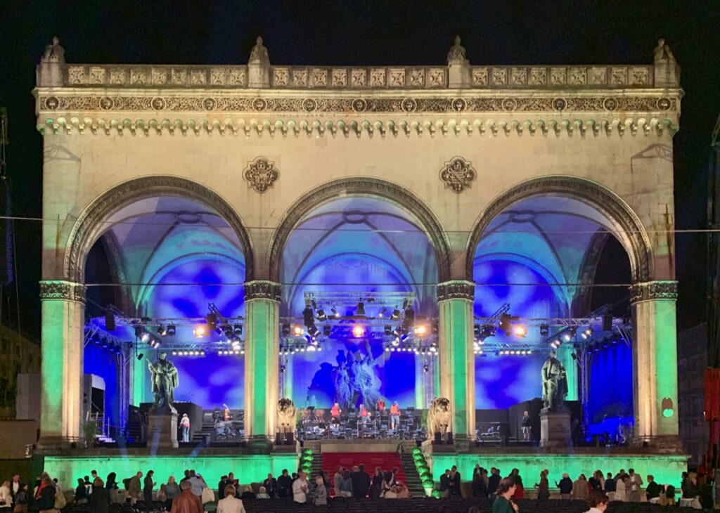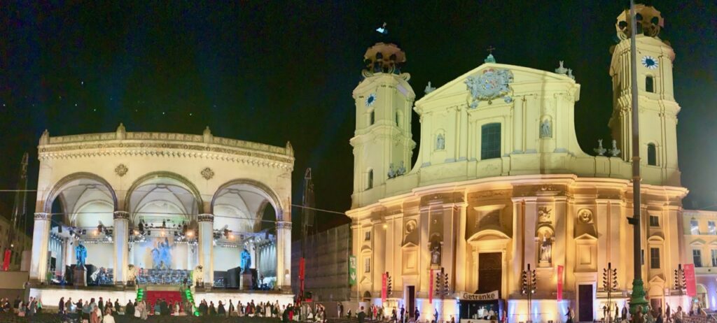 Einer der schönsten Plätze – vielleicht in Europa – ist ohne Zweifel der Odeonsplatz in München. Aus aktuellem Anlass sollen in diesem Teil der Serie „Sommer in der Stadt“ einmal mehr die Bilder wirken. Anfang Juli finden die beliebten Open-Air Konzerte am Odeonsplatz statt. Dafür werden die Fassaden der Theatinerkirche und der Feldherrnhalle besonders schön mit farbigem Licht beleuchtet.