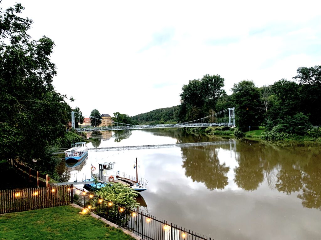 Dann gibt es noch die Freiberger Mulde, die auf dem Hauptkamm des Osterzgebirges in Tschechien entspringt. Folgt man der Freiberger Mulde von ihrer Quelle im tschechischen Moldau, führt sie einen durch das sächsische Burgenland, bis sie schließlich in Sermuth, einem Ortsteil von Colditz, mit der Zwickauer Mulde zur Vereinigten Mulde zusammenfließt. Eine Zeit lang galt die Mulde sogar als schnellster Fluss Europas. Am Abend gab es noch einen netten Ausklang im traditionellen Restaurant Raffinesse mit wunderbarem Ausblick auf die Mulde.