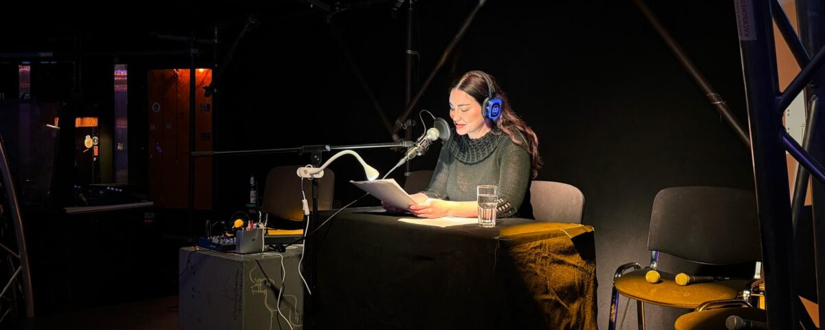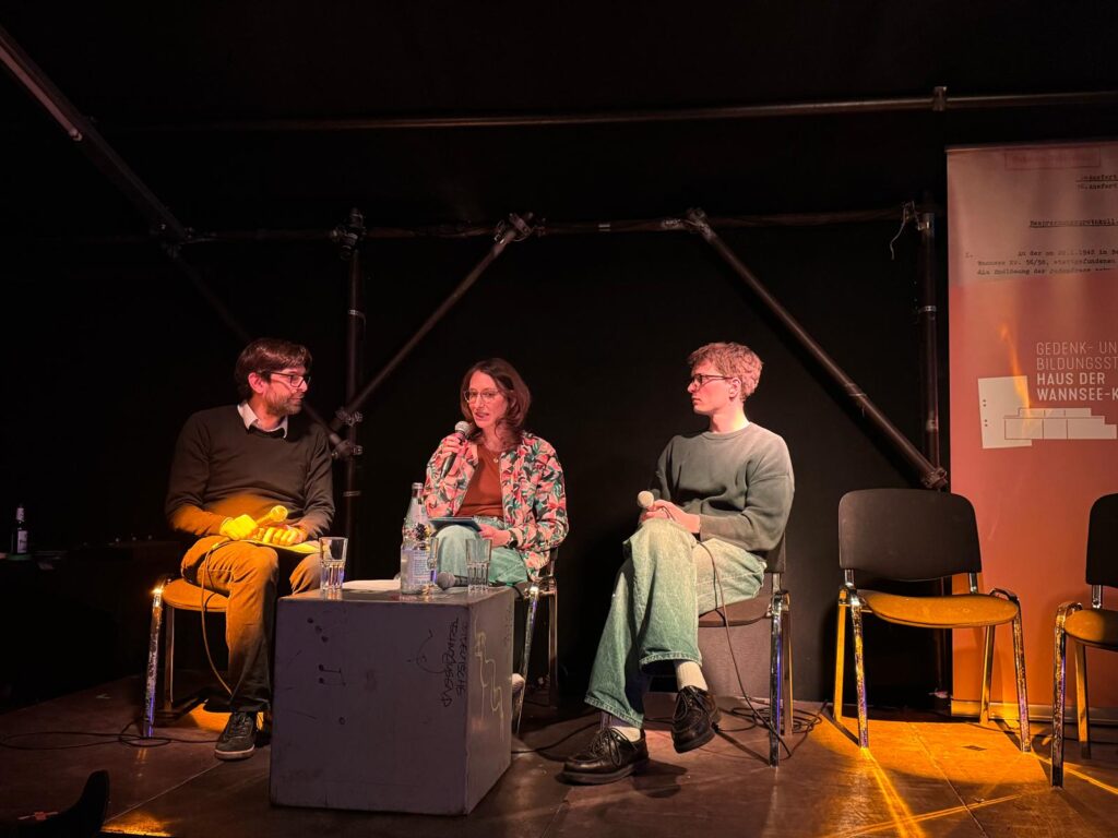 Ergänzt wurde der Abend durch das Live-Hörstück „Fußnoten“ zu antisemitischen Vorfällen in Gedenkstätten (von Stella Leder, eingerichtet von Benno Plassmann, gelesen von der Schauspielerin Lisa Ullrich), durch ausgewählte Podcast-Ausschnitte sowie ein Werkstattgespräch mit Janis Gebhardt, Geschäftsführer von Studio Jot, das die Produktion des Formats begleitete.