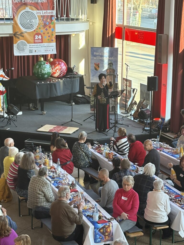 Aufgrund der positiven Erfahrungen und der hohen Nachfrage im vergangenen Jahr wurde die Veranstaltung in diesem Jahr in das großzügige Ernst-Reuter-Foyer verlegt. Die ursprünglich für 100 Gäste geplante Feier konnte kurzfristig auf 130 Teilnehmende erweitert werden. Neben Seniorinnen und Senioren nutzten erstmals auch Jugendliche sowie wohnungslose Menschen die Möglichkeit, sich für das Einsamkeits-Weihnachtsessen anzumelden – ein bewusst inklusiver Ansatz, der die Vielfalt der von Einsamkeit betroffenen Gruppen sichtbar machte. Die Gäste erwartete ein liebevoll gestalteter Abend mit traditionellem Weihnachtsessen, musikalischer Begleitung, einer Tanzshow, weiteren Unterhaltungselementen sowie einer Bescherung, die für viele ein besonders bewegender Moment war. Im Mittelpunkt stand dabei nicht nur das Programm, sondern vor allem das Gefühl, gesehen zu werden und diesen besonderen Abend nicht allein verbringen zu müssen.