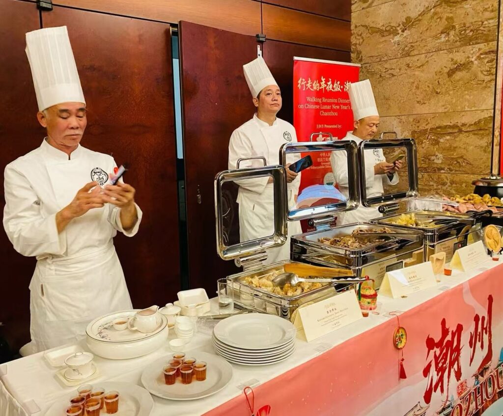 Anschließend dann der musikalische Ausklang durch das Jugendstreichorchester „Strings Factory“. Für das folgende große Buffet war eine Köchedelegation aus Chaozhou/ Guangdong eingeladen worden, dessen Küche einen hervorragenden Ruf genießt. Unter dem Motto „The Walking Reunion Dinner“ – Eine kulturelle Erzählung der Chaozhou-Glücksgerichte“, wurden sechs Glücksgerichten und eine Kanne Gongfu-Tee angeboten. Auf diese Weise entfaltete sich eine kulinarische Reise der kulturellen Rückbesinnung nach dem Grundsatz: „Durch Speisen wird Kultur vermittelt, durch Geschmack Tradition bewahrt“.
