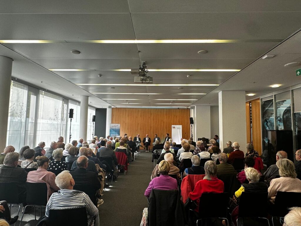 Knapp 100 Teilnehmer folgten der Einladung der Senioren-Union Berlin. Bei der Podiumsdiskussion im Konrad-Adenauer-Haus im Tiergarten am 16. April der CDU diskutierten Johannes Kraft, verkehrspolitischer Sprecher der CDU-Fraktion im Berliner Abgeordnetenhaus, Arne Herz (CDU), Staatssekretär für Mobilität und Verkehr, Stefan Demuth, Leiter Tarif- und Erlösmanagement der BVG, sowie Matthias Oomen, Pressesprecher und Vorstandsmitglied von PRO BAHN Berlin-Brandenburg, Hauptstadt. Die Moderation übernahm Johannes Werner, Landesvorsitzender der Senioren-Union Berlin. Im dritten Teil der Diskussion ging es um konkrete Auswirkungen der Verkehrspolitik auf den Alltag älterer Menschen. Themen waren Barrierefreiheit, E-Scooter-Regulierung sowie die Entwicklung verkehrsarmer Quartiere.
