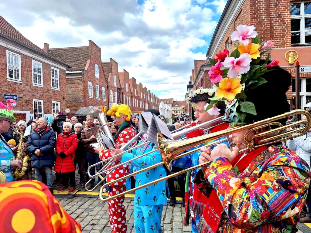 Blumengeschmückte holländische Straßenmusiker sorgen im Holländischen Viertel für tolle Stimmung (Foto: Hans-Peter Gaul)