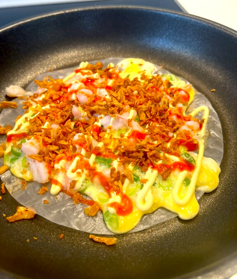 Garnelen halbieren oder dritteln. Frühlingswiebel waschen und in feine Ringe schneiden. Ei in ein Schälchen geben und verquirlen. Nun die Frühlingszwiebelringe zugeben und gut mischen.  – Reispapier in eine erhitzte antihaftbeschichtete Pfanne geben, regelmäßig wenden, bis die ersten weißen Flecken zu sehen sind. Dann die Eimasse auf dem Reispapier verteilen. Wenn das Ei gestockt ist, Garnelen darauf verteilen und je nach Geschmack mit Sriracha und Mayonnaise würzen. Abschließend die Röstzwiebel auf der Pizza verteilen.
