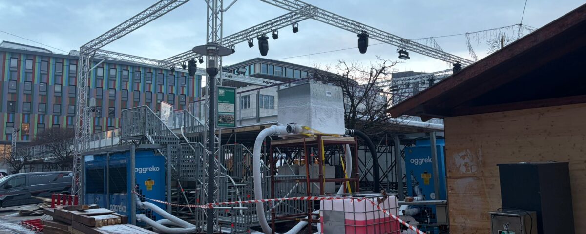 Der Wintertraum wird wieder am Kennedyplatz in Essen aufgebaut – und das Konzept ist besonders: Eislaufen auf zwei Etagen. Über eine rund 120 Meter lange Rampe kommt man auf Schlittschuhen nach oben. Der Aufbau ist deutlich zu sehen: Gerüste, Holzbuden, Technik und Material stehen bereit – die Jungs sind noch dran, es wird aktuell noch geschraubt, verkabelt und montiert.